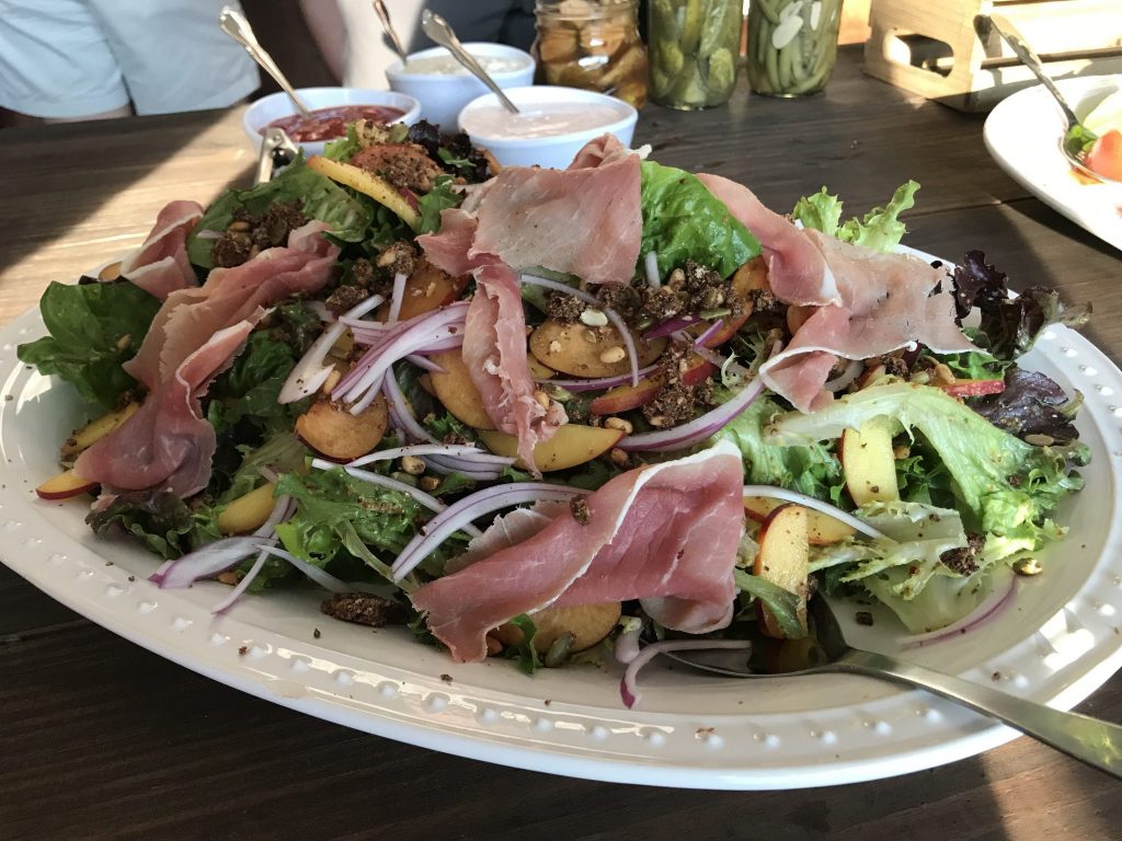 Farmhouse Salad. Bacon Farm baby lettuces, berries, stonefruit, honey granola, & muscadine mustard vinaigrette come together to make not your average salad. This is as beautiful as it is tasty.