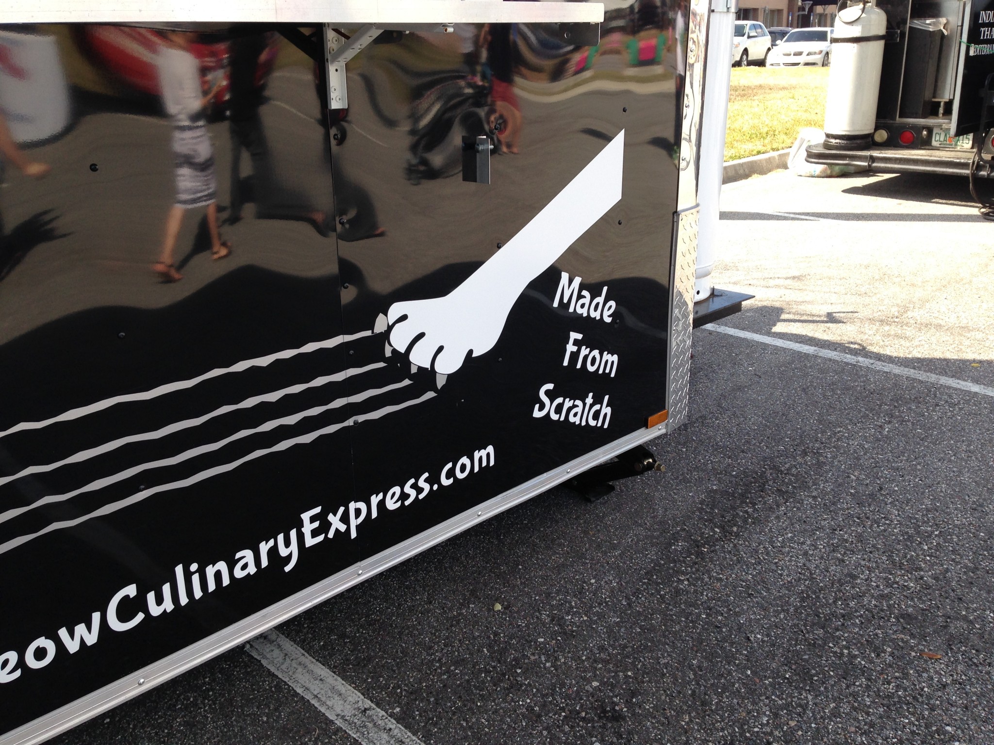 The Cats Meow Culinary Express is one of the newest trucks in the Jacksonville food truck lineup, so we were excited to try out some of their offerings. One of the owners of the truck was taking orders at the window. She was incredibly friendly and inviting. After checking out their menu, we couldn’t wait to place our order. They have some really fun and unexpected menu items. We decided to try the Fontina Stuffed Risotto Balls with Marinara ($3.50) and one of their much-anticipated (by me anyway) Spud Subs. After much soul-searching, I settled on the Sweet Potato Spud Sub ($6.00). This lived up to everything I thought it would be. They basically took a perfectly baked and seasoned sweet potato and stuffed it full of sliced chipotle-seasoned chicken and a melty, cheesy awesomeness that they call “blue cheese fluff”. And you eat it like a sub sandwich. Crazy, I know. But it totally worked and was amazing. The sweetness of the potato was the perfect balance to the spicy meat and the tangy cheese. My Spud Sub came with some sort of cold lemon orzo salad that wasn’t mentioned on the menu, but what a pleasant surprise! After polishing off my entire meat and cheese-stuffed potato, the salad was very refreshing and light. It was a really nice compliment to the Spud Sub. The Risotto Balls were also a big hit. They offered up more melty cheesy goodness but this time stuffed inside fried balls of rice. This was served with marinara sauce which had great flavor but was cold. With such attention to detail and flavor on everything else, it would have been great to have a nice warm side of marinara to go with the Risotto Balls. Overall, we had a great experience with The Cats Meow Culinary Express. With options we haven’t tried like the Navajo Tostada and Smoked Chicken BLT Waffle-wich on the menu, I can’t wait to hunt down this little food truck and try more of what they have to offer.