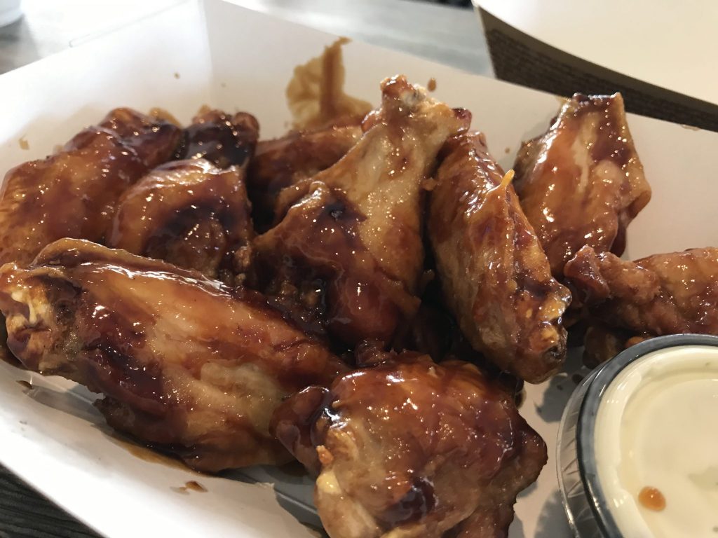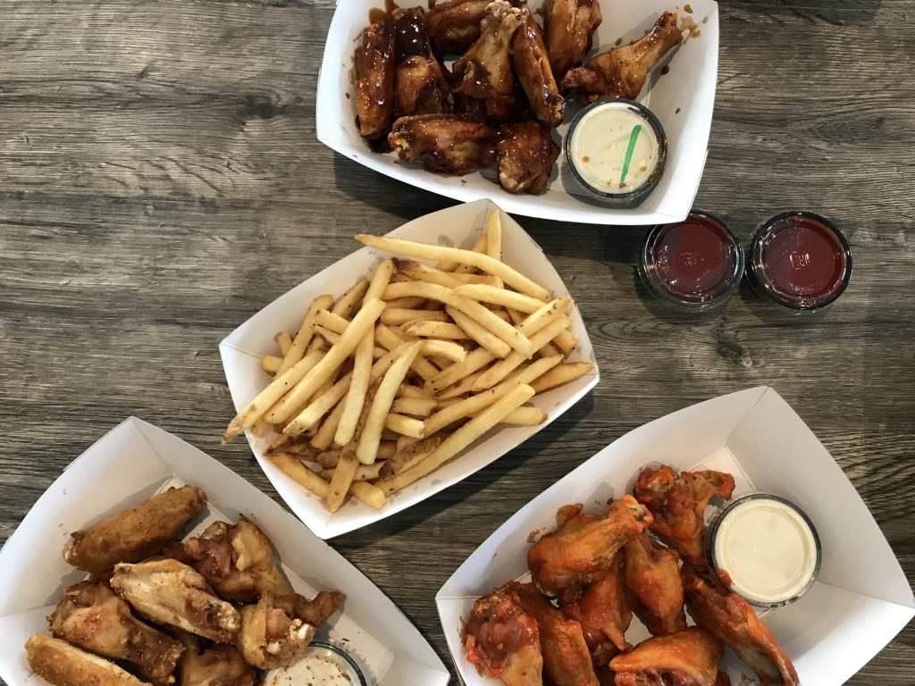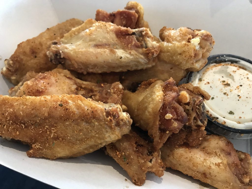 Our wings arrived in cardboard boats, with extra boats for bones, plus extra napkins and wet wipes. The teriyaki were sticky-sweet like you’d expect. The medium were a very tolerable medium spice. If you like spicy, go higher than medium. The Blue Sky dry rub were fantastic. Salty and savory, but not overly salty. The dry rub was an enjoyable spice mix that would be good sprinkled on a lot of things- fries, burgers, etc. In fact, we rubbed our fries in the dry rub in the bottom of the boat. Yummy! The fries themselves were fine. The ranch and bleu cheese dressings that came with the wings were obviously bottled, which is par for the course. Pun absolutely intended.