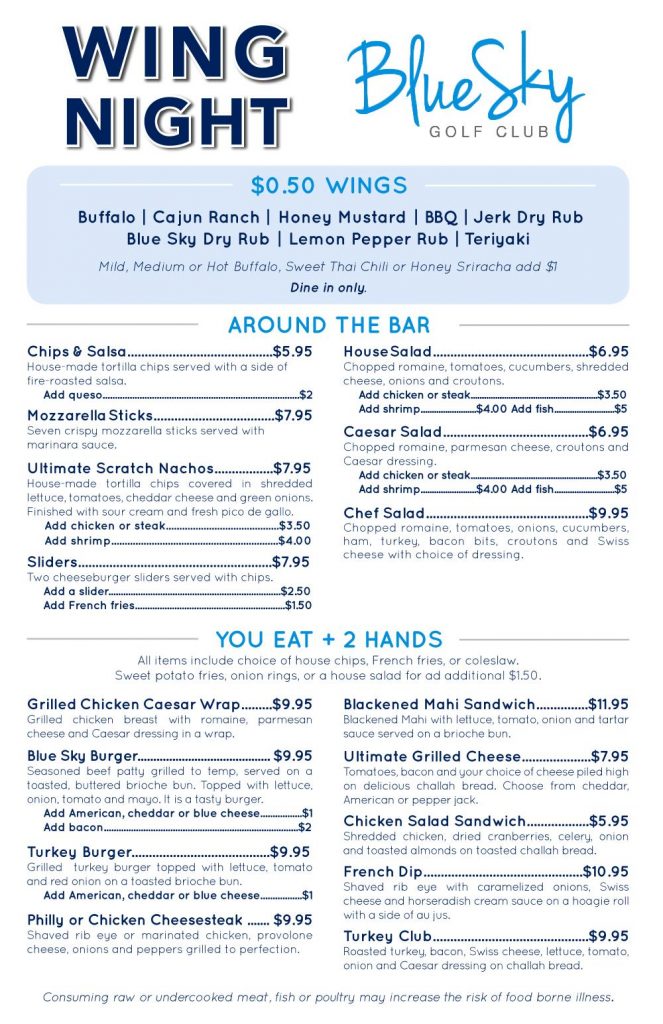 Overall wing night at Blue Sky Bar and Grill was a positive experience. The service was friendly, there was a decent amount of wing choices, the space was clean, and the view was pleasant. Were they the best wings of my life? No, but they were solid. Would I have liked better dressings? You betcha. But 50 cent wing night is a heck of a deal. We ended up spending about $20 for two people, which is practically unheard of for table service, plus we took almost half of our wings home. If you love wings, or have hungry tweens and teens to feed, or just appreciate a deal, Blue Sky Bar and Grill’s 50 cent wing night is worth checking out. I’d get there before or around 6pm to avoid too much of a wait.