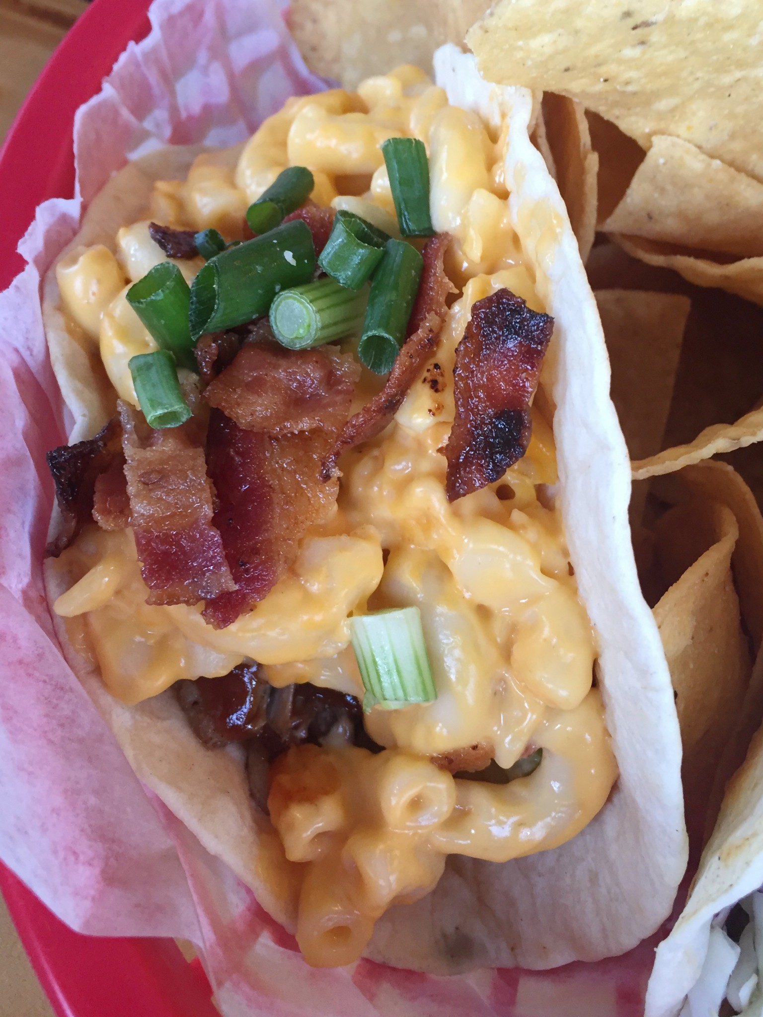 Our other tacos were equally tasty. The Steak Jimichurri ($3.95) was tasty with its flavorful chimichurri sauce and fresh cilantro. The steak was tender and nicely prepared on this one. The Malibu ($3.95) was also good. Hubby chose to have the fish on this one served blackened and again, this fish was cooked well and was flaky and flavorful. The guacamole on this taco added nice rich flavor and freshness. The winner for creativity, however, was the Johnny Utah ($4.25). This standout taco came piled high with juicy pulled pork, then topped with creamy mac and cheese, bbq sauce, and crispy bacon. The dill pickles nestled underneath the pork added a nice crunch and tanginess. Again, the main drawback of all of our tacos (if you can call it a drawback, really) was that they had too much on them. They were so stuffed with toppings that they were a little messy and tough to eat. But the flavors of each one worked and the ingredients were fresh and tasty. It was just a lot more food that we had bargained for, which could be a good thing or a bad thing depending on how you look at it.