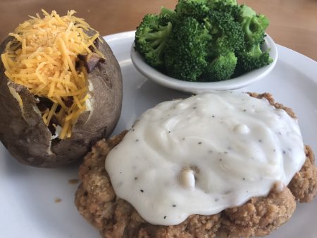 For dinner we had country fried steak, loaded baked potato, and broccoli ($8.99). The country fried steak was quite good, but the gravy on it stole the show. We enjoyed dipping bites of biscuit in the gravy, and there was plenty of it to spare. The loaded baked potato had a treasure trove of perfectly crisp bacon inside. This is not the paper thin Waffle House bacon. This is thick, quality bacon. Everyone should make their bacon this delicious. The broccoli was perfect due to what it lacked. Namely, butter. This broccoli was cooked perfectly, not one second over or under cooked. It was just freshly steamed broccoli.