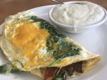 For breakfast we had a veggie omelet and a meat omelet with grits ($7.99 each omelet). The veggie omelet comes with onions, peppers, spinach, tomatoes, and mushrooms. We omitted the the onions and peppers for allergy reasons, but appreciated the variety of other veggies offered. The meat omelet was stuffed with bacon, ham, and sausage. The omelets were obviously prepared with care. They were perfectly symmetrical, folded nicely with the veggies/meats and a little cheese distributed throughout. They were plenty big with a generous amount of fillings. The grits were your standard slippery, diner grits. They weren’t memorable.