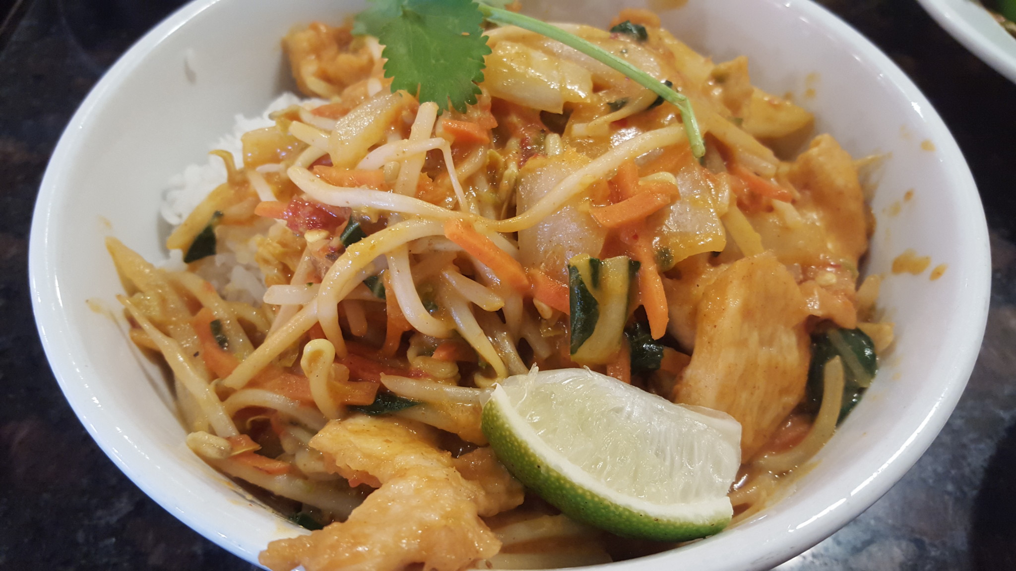 Thai Fire Curry ($8.95, Black Market Menu): This dish is marked as a Black Market menu favorite and there is a reason why. Seared chicken is simmered in a spicy Thai red coconut curry and seasoned with lemongrass, garlic, and ginger and tossed with bok choy, onion, carrot, and bean sprouts. It’s also garnished with fresh lime for a slight citrus flavor that lingers after each spicy bite. This dish is surprisingly light and refreshing with the lemongrass giving it a bright herbal flavor. I love this dish. I can’t talk enough about how much I love this dish. It’s worth joining the Mama Fu’s Club to have it. The curry is heavy on the vegetables and chicken and light on the cream part of the curry so the rice absorbs nearly all of it. I added sriracha because why not and that added the perfect heat level.