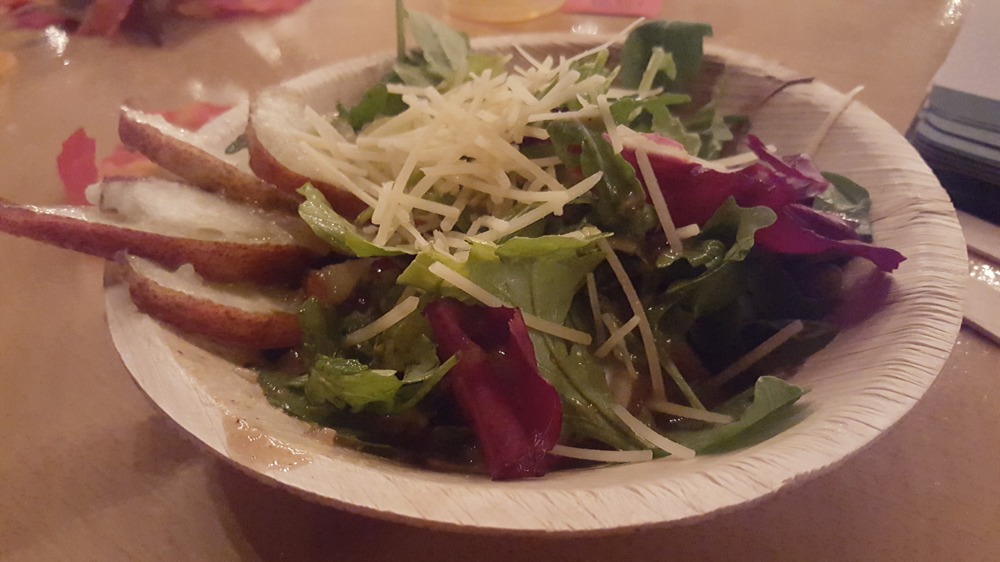 Sweet and Spicy Fall Salad: (V) Juicy sliced red pear, vegan candied pecans, and vegan (or traditional) parmesan on baby arugula, frisee, radicchio greens, and dressed in a maple balsamic vinaigrette. This salad was delicious and beautifully seasonal. The candied pecans mixed with the maple balsamic gave a perfect sweet and salty combination. The texture of the tender pear versus the crisp greens also made for an excellent salad. We loved all the combinations present here.