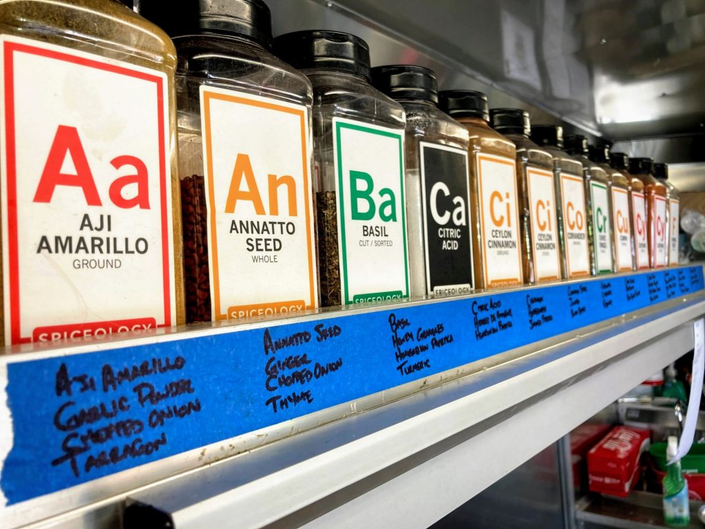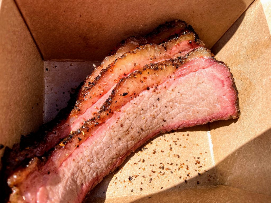 Beyond the sauces, Evan also makes his own rubs. The spice rack in the truck is a long and distinguished line of various spices. Highlighting the rack is a coffee-based rub he calls the “You Got Beef Bro” rub that he uses for his brisket. The base of this rub is coffee from local coffee roaster Pura Bean Coffee Co. Combining this rub with his USDA Prime brisket is a beautiful marriage of meat and spice. A bit of heat, just enough to keep your palate engaged.
