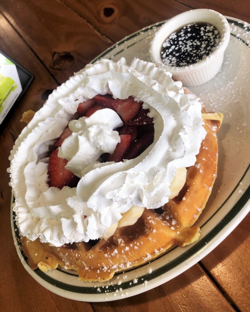 After the benny, my sweet tooth was aching for the waffle, which was piled (like really piled) with fresh strawberries, bananas, whipped cream and dusted with powdered sugar. It was huge. I mean there is no way that even if I ordered that alone, that I’d be able to eat it. My tip is to order for the table and share that baby. I’m a big fan of food pooling (everyone orders something different and then you pass it all around) and this waffle is made for that. The actual waffle was fluffy and not overly sweet. I think kids would love all the whipped cream on top — well, I loved it too, so there’s that.