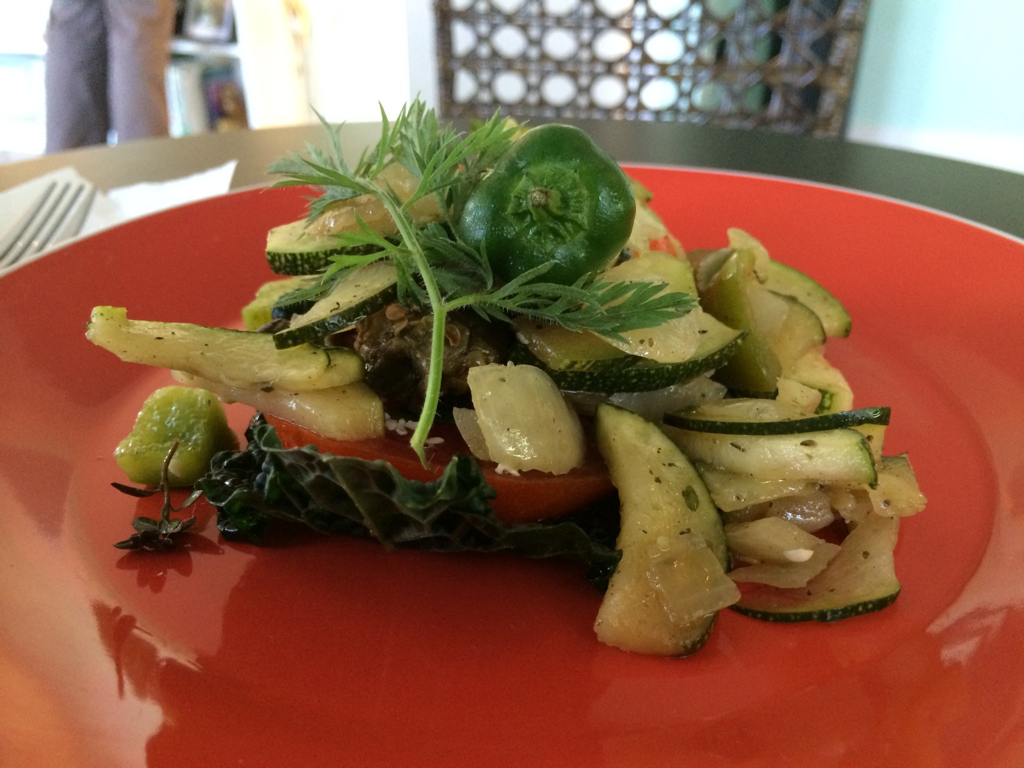 Alright, now let’s talk food. All foods offered at Tea Haus are vegan, gluten free, and non-GMO. Sounds like bland boring and no fun to many folks. However, we found it was anything but those things. It was much more along the lines of unique, flavorful, and delicious. Chef Rosaria Anderson makes 3 trips a week to local farms to pick out produce fresh from the farm so that Tea Haus can offer the freshest and highest quality produce around. There’s something to be said for the higher nutrient content that’s found in vegetables harvested within 48 hours of eating them. Chef Rosaria creates 4 or 5 different meal options on offer each day that are offered as grab and go options or available to be plated and served while you’re at Tea Haus. While we were there we got a chance to try a few different dishes. First up were the BBQ chicken wraps. These were pretty tasty. You could taste how fresh the wraps were. The “chicken” had a mild BBQ flavor and surprisingly the texture was pretty close to that of chicken. If I were in the mood to have something healthy to eat I’d be really happy I chose these. I definitely enjoyed them. Another dish we got a chance to try was the ratatouille. This stuff was darn good. A really nice mix of flavors from fresh produce and spice offered a wonderful healthy and delicious dish. Next up was the vegetable stack (I actually didn’t get the name so that’s what we’re calling it). This one I can’t really critique because it contains beets and raw tomatoes which are two things I’m not a huge fan of. I wouldn’t have mentioned it if I didn’t love and want to include the photo we took of the dish. Next were the hemp balls. They sound weird, but they’re not. These are basically little balls of dates hemp seeds and a few other ingredients that taste like a healthier version of candy. If you like dates you’ll really enjoy these. I know that I did. Last but not least was the chorizo and grits cakes. This dish was the star of the show. After one bite I was wondering, “Why do I eat meat again?” I normally despise meat substitutes because they never taste like meat. They usually look like meat and sometimes even smell a bit like meat but they rarely taste like meat. This vegan chorizo tasted like spicy ground beef. It had the right look, smell, taste, texture, and flavor. I was blown away! The grit cakes were really nice too. Good texture and flavor and definitely not fried. If you like deliciousness you need to try this dish. I’m fairly sure this dish is just offered on Tuesdays since the offering changes every day. So, call ahead to make sure it’s available if you’re coming just for this one.