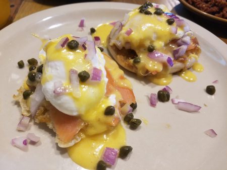 Alright lovelies, it’s my turn to talk about my breakfast items and the great choices I made off Brunch Haus’ impressive menu. I judge all establishments by their Eggs Benedict because every ingredient is an opportunity to show love and respect to the diner with homemade components or to scare the diner off with mass produced premade components. Listen up people, Brunch Haus is doing it right. There are 5 “Bodacious Bennis” to choose from at Brunch Haus. I opted for the Smoked Salmon Benni which included the obvious smoked salmon, poached eggs, hollandaise, capers, and red onion ($14). Let’s build this benni. Step 1: the English Muffin. Too often English Muffins are toasted to becoming mouth razors and are difficult to cut much less chew. This was crisp but soft, both Evan and I were enamored with the level of toasty-ness. Step 2: the Smoked Salmon. This was abundant, flavorful, and tender. It was thinly sliced enough where it was easy to make bite size and covered the entire English muffin, which shouldn’t be a concern but many places skimp. Step 3: The Poached Egg. Unlike Evan’s egg, mine was perfectly poached. My best friend jokes I’m going to go to jail over assaulting someone over an incorrectly poached egg, and she’s likely not wrong. Brunch Haus knows how to poach an egg, which should be Breakfast 101. Step 4: The Hollandaise. Thank you Brunch Haus for making your own and not using jarred or packet. Thank you. THANK YOU. Expect creamy yolky not too acidic heaven on these bennis. Step 5: Capers and Red Onions. Both were heavy, which results in my only complaint. Red onion destroys the flavor of all things when in excess. These should be cut thinner and more evenly and the quantity reduced slightly so as not to overpower. I went the route of knocking them off the top with my fork. (Brittny)