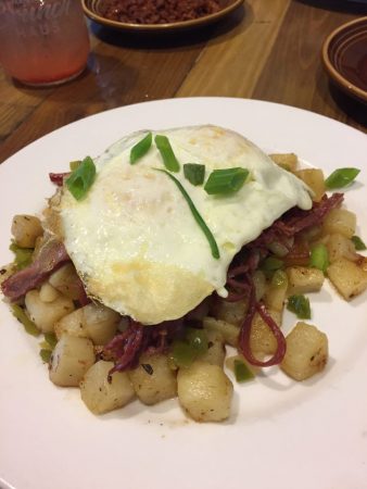 Once seated, our server was chipper and had some really great recommendations about the menu. I would strongly recommend asking your server about the menu rather than making assumptions, as there are some real hidden gems worth finding out about. The menu options are abundant and it’d be easy to be overwhelmed by having to choose between classics and innovators. In particular, we are referring to the “Brilliant Brunch” section of the menu. You choose the actual menu item you’d like, such as an omelette, a hash, a wrap, etc, and then you choose the topping combination. Definitely ask the server’s preference as well, because I was recommended the Hash ($7), Haus style (+ $5), and it didn’t disappoint. I was a little nervous about getting a hash and about corned beef with it, primarily because I had a bomb Mexicali Wrap at the previous establishment. However the choice I made turned out to be both more flavorful and more of what I think a great breakfast dish is than what I was originally considering. (Evan)