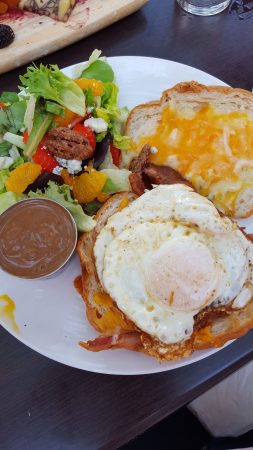 As we waited I noticed the two waitresses moved seamlessly through the tight fitted tables refilling drinks, clearing dishes and dropping food off at each other’s tables. The other guests seemed unfazed and content, never realizing the Café was understaffed. Meals came out promptly, drinks were refilled steadily, and the overall atmosphere was casual just like a Sunday should be. Our Cheese Plate and Caprese Salad were swiftly placed on our tables with no description of the dishes, only after I asked did she inform us. The Cheese Plate was the most impressive and biggest bang for your buck. At $12 the plate was covered in an assortment of fresh strawberries, blackberries, apple slices, apricots, fig compote, cinnamon pecans, crostini, and a hearty portion of a Porter Cheddar, Derby Sage, and Brie. I was in heaven and could have been content with just the Cheese Platter, rivaling any fine dining restaurant’s cheese board. The Caprese Salad ($9) was just as impressive. The creamy burrata lay on a bed of mix greens and basil surrounded by pesto tomatoes, sharp red onions and finished with Balsamic reduction. It was the perfect balance of acid from the tomatoes, cream from the burrata, bite from the onions, and sweetness from the balsamic drizzle. It left me wanting to lick the plate and wonder how I’ll have room to polish off my entrée.