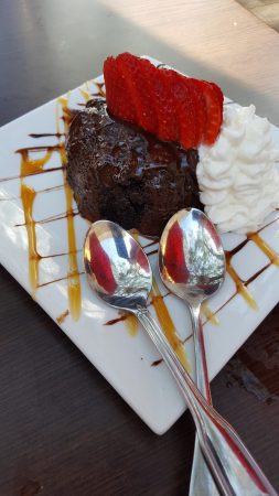Lucky for me I have a bottomless pit as a stomach. As our entrees hit the table, my sister and I were excited to see what was next. Her Shrimp and Grits ($12) were expertly laid out on a rectangular dish. Velvety yellow grits almost overflowed off the edges and five large shrimp were placed along the center. She feared the dish would be too spicy, as the gorgeous but spice infused shrimp were covered in an orange, oily rub, which crowded the grits as well. To both of our surprise the dish had just the right amount of kick, not too overpowering. The goat cheese grits complimented the perfectly cooked shrimp and cut the bit of spice found in the dish. The only complaint we could find was that the tails were left on the shrimp and not exactly finger friendly to remove. Her fruit surprisingly did not mimic the fresh fruit found on our Cheese Plate, but included blueberries, pineapples and melons. My Breakfast Croissant ($10) was exactly what I hoped for. The flaky bread was covered in warm melted cheddar jack cheese, crispy salty bacon, and finished with a flawless over easy egg. Half way through my sandwich I bit into the liquid gold yolk that oozed over my fingers and buttery bread. If you’re not one for soft yolks, I would recommend asking for a fried or well done egg. The $1 upcharge for the Baby Blue Salad was well worth it. Boasting with oranges, strawberries, gorgonzola, cinnamon pecans and a rich Balsamic dressing, my only wish was to have more funky cheese! I devoured my plate and was looking forward to the highly recommend rosemary lemon squares by our server. To our disappointment they were out of the squares so we ordered the Molten Chocolate ($5) instead. The cake was considerably large and at first glance dense and rich. I told myself I was only going to have one bite but found myself going back for more. To our delight the cake was fluffy, light, spongy, warm and the perfect ending to our perfect Sunday.