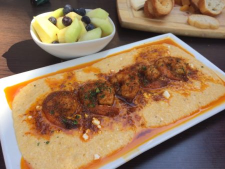 The menu is your typical Southern brunch selections, including Eggs Benedict, Crab Cakes, a mix of Fresh Salads, and Quiche. My sister and I were greeted by a bustling server who ushered us to our outdoor table quickly, mentioning they were down an employee and just got busy. Sure enough almost every table was occupied. She dropped menus and took our drink order. A few minutes later our waters were delivered by the only other server there and asked if were ready to order. My sister asked her opinion on either the Shrimp and Grits or the Eggs Benedict. She confessed this was her first brunch shift and was hesitant on a decision but ensured my sister she couldn’t go wrong either way. We decided to start with the Cheese Plate and new Schiebler Caprese Salad, (clearly we have an obsession with cheese) then for entrees she decided on the Shrimp and Grits with a side of fruit and I chose the Breakfast Croissant with a substitution of a Baby Blue Salad as my side. I’ll get to dessert later.