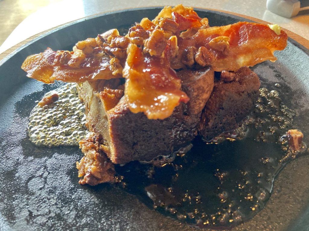 - Breakfast Bread Pudding – If you like brunch a little on the sweeter side. Firebirds has you covered with the Breakfast Bread Pudding. The bread pudding is served on a ripping hot cast iron plate and topped with applewood smoked bacon, pecans, cinnamon, and brown sugar. It’s served with bacon-infused maple syrup and poured tableside. The maple syrup hits the hot cast iron skillet with a satisfying sizzle that makes others at the surrounding tables turn their heads and look. Pancakes and waffles are old and busted. Breakfast Bread Pudding is the new hotness.