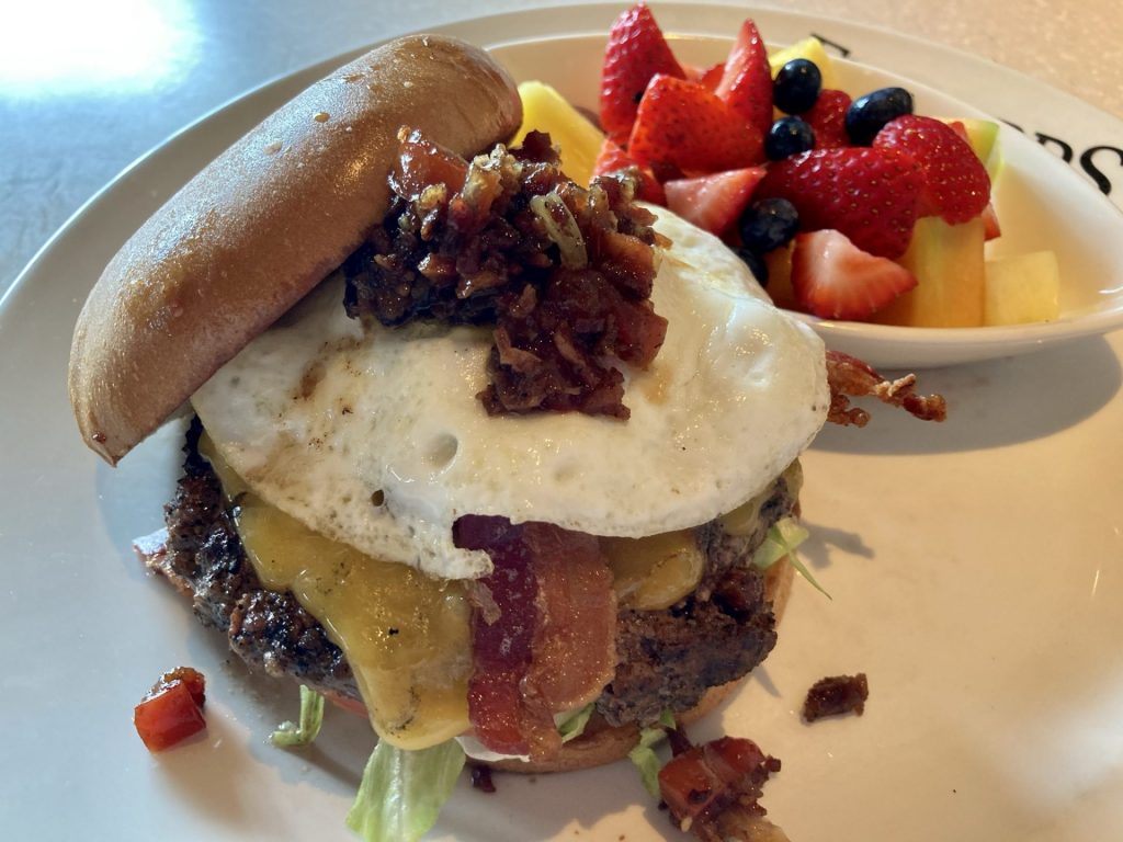 - Brunch Burger – And now back to the hearty. The brunch burger is a wood-grilled burger, cooked to your preferred temp, and topped with sharp cheddar, applewood smoked bacon, lettuce, tomato, fried egg, and bacon jam. I requested my burger medium and it was perfect with a nice pink center. And it was thick. It wasn’t indicated on the menu, but it had to be at least a quarter pound, maybe even a third. The bacon jam had a bit of kick to it, but a pleasant kick, not a kick to the throat.