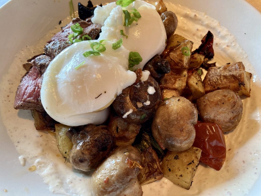 - Steak & Egg Bowl – A wood-grilled tenderloin and poached eggs served with roasted potatoes, mushrooms, and tomatoes with a creamy horseradish sauce. The horseradish sauce was expertly painted on the bottom of the bowl. The steak was cooked to a perfect mid-rare; tender, juicy, moist, with gorgeous red center. The poached eggs with its runny yolk gave the dish a silkiness and luxuriousness. The potatoes were soft and fluffy on the inside. The mushrooms and tomatoes were an umami bomb. Swiping each bite through the horseradish sauce gave a nice bite to counteract the richness of the other ingredients. A hearty dish that will stick with you and power you through the rest of the day.