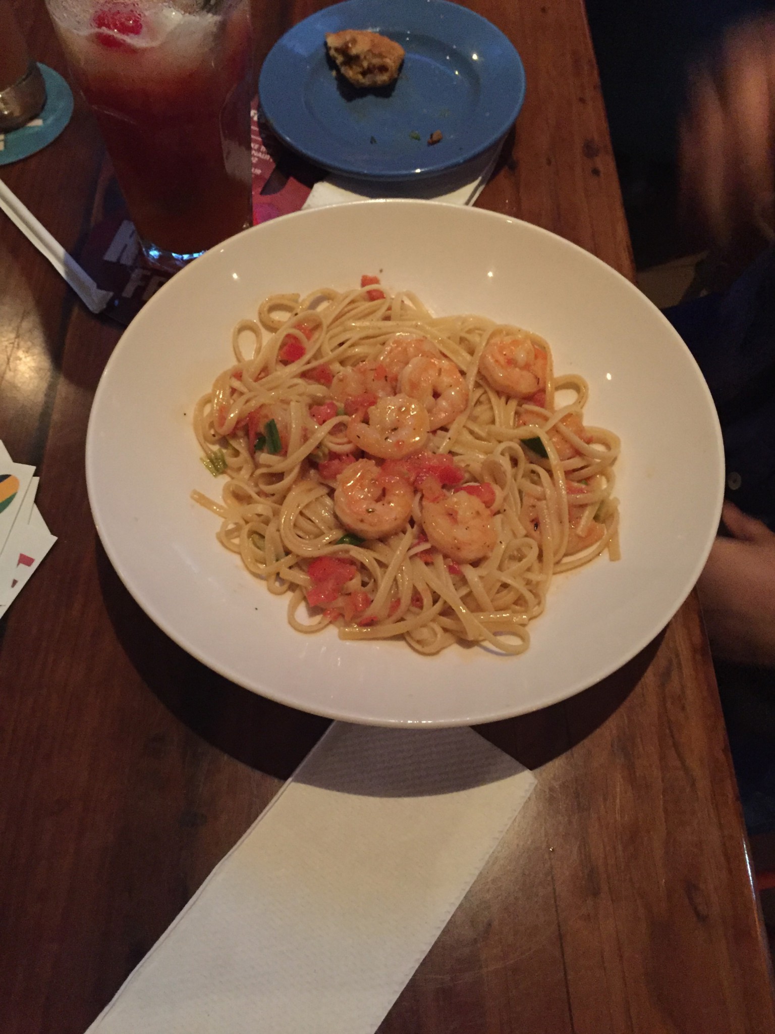 I ended up ordering the Taste of Jamaica platter and my dining companion went with the calypso shrimp linguine. The Taste of Jamaica platter consisted of very generous portions of pulled pork, jerk chicken, callaloo, plantains, yellow rice and black beans, and an empanda. The pulled pork was delicious and the seasoning was on point, as was the jerk chicken. I had never eaten callaloo before but really enjoyed it. It reminded me of collards with a Caribbean twist. The plantains were a great addition to the plate and acted as a nice refresher between the other items. The rice and beans were also flavorful and, as I said to my friend while eating them, I would have been a happy camper with just a huge plate of rice and beans for dinner.