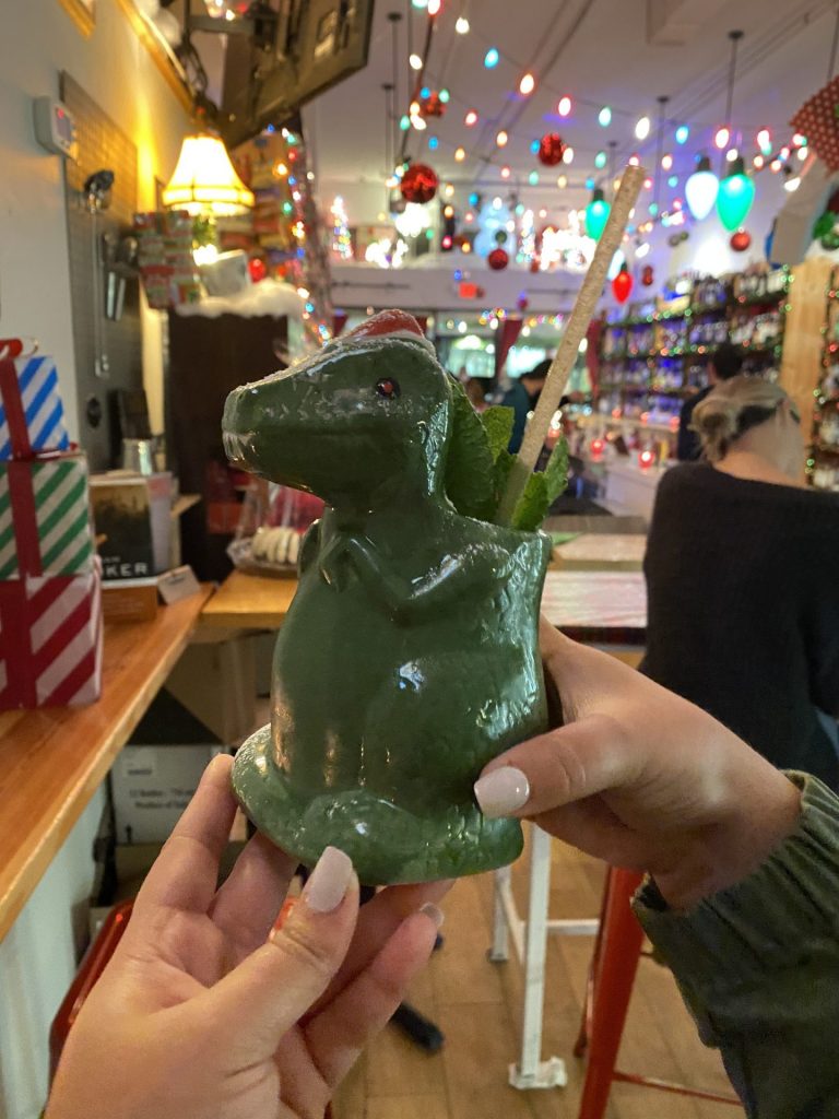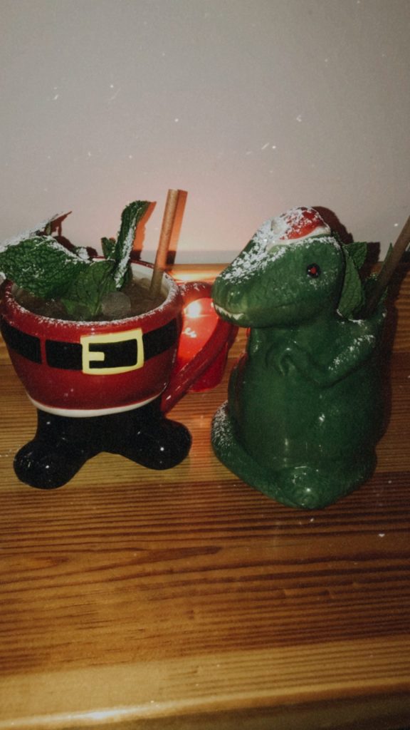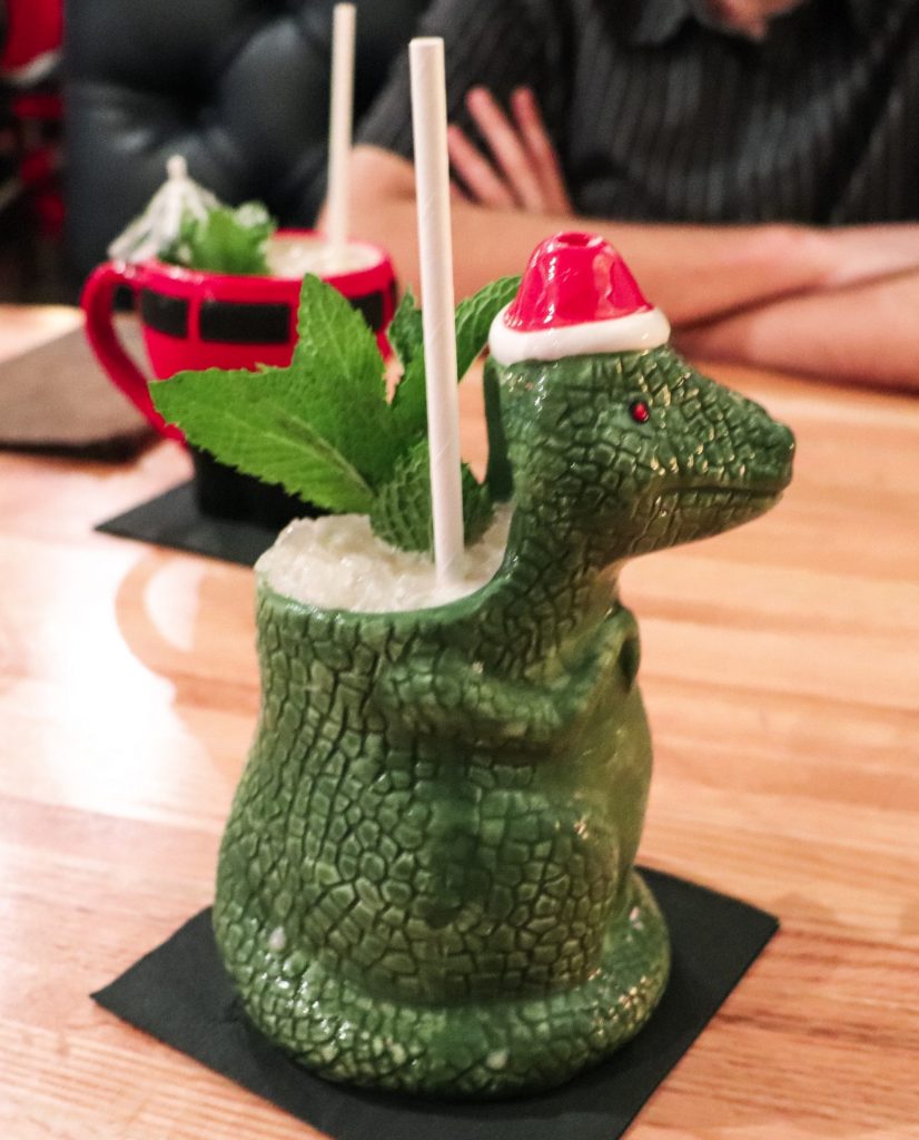 First, we tried the SanTaRex which had the cutest presentation (A T-Rex mug with a Santa hat; I mean, come on). This one was a tequila-based drink with a chocolate flavor you couldn’t miss. I would describe this drink as an iced “hot chocolate” with a hint of mint. SanTaRex was very well-mixed, as the taste of the liquor was barely present.