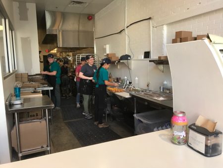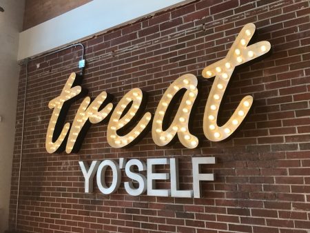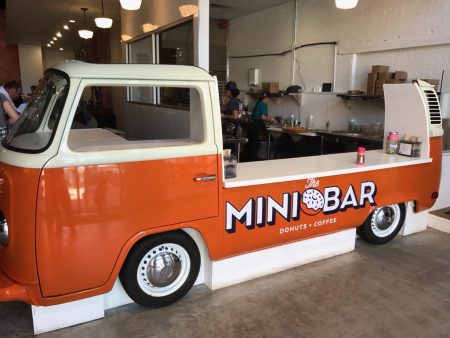 No doubt you have already seen much of the essence of The Mini Bar in your news feeds lately- the Mini Bar bus where donuts are served and the giant Treat Yo’self sign serve as visual anchors to the enormous industrial space. There are plenty of tables and a few couches inside, along with the tables, corn hole game, and chalkboard for kids in the courtyard.
