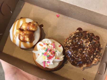 The first flavor we dove head first into was strawberry sprinkle. The donut itself was a wonderful little ball of fried up goodness. Too often when you get standard mini donuts at the fair or special events they have a stale grease taste or are just too greasy overall. Not so with The Mini Donut Bar! It was fried just right, not overdone, not greasy at all. The frosting tasted great, not too sugary, not overpowering. Just the right amount of sweet strawberry flavor. Next we tried lemon poppyseed mini. This one had a very subtle lemon flavor. I could hardly taste the lemon actually. I wouldn’t order it again although I will say my partner in crime really liked it and said she could taste the lemon flavor in the icing. Next we went for the Samoa! Who doesn’t love a Samoa Girl Scout cookie? This one wasn’t as good as the cookie but was still darn good. Toasted coconut met a dark chocolate flavor topped off by a strong caramel flavor shining through. We thought it was great although more like a dark chocolate toasted coconut with caramel than a Samoa Girl Scout cookie. Following samoa we tried the sea salt caramel popcorn donut. This one comes with a few kernels of Sweet Pete’s caramel corn on top of the frosting and finished with caramel sauce. We love the partnership of featuring another local product, especially since Sweet Pete’s confections are sheer perfection. This donut was divine. The housemade caramel sauce was excellent and the caramel corn did not distract from the donut itself, it added some additional flavor and texture. If there is one you shouldn’t miss, it’s this one. Next up was the birthday cake donut. This donut can be ordered with vanilla frosting or chocolate buttercream. We went vanilla. Holy cow was it sweet! You must love really sweet things and love cake to love this one. It was a bit sweet for our taste but we ate every bite anyway. The donut we tried last was our favorite and that was the brown sugar pop tart weekend special. This donut offered the most complete combination of flavors and textures we tried. Sweet combined with that wonderful slightly grainy brown sugary taste and feel plus a bit of crunch from tiny squares of pop tart on top made this donut the pick of the pack.