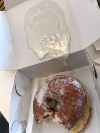 We went one day about a week after they opened. We tried a few donuts and the fried chicken doughwich ($6.50). The fried chicken doughwich was completely smooshed in the box, with the top donut “bun” stuck to the top of the box when we opened it. We peeled it off and reassembled the doughwich, but lost all of the icing in the process. The icings were runny and the donuts overall lacked flavor. We didn’t write about Good Dough then because they had just opened and were not able to keep up with demand. We decided to lay low and let the novelty wear off before we went back.