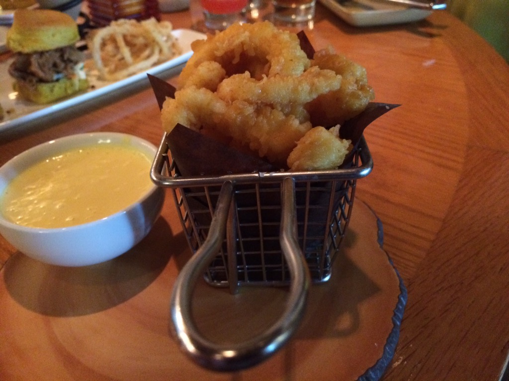 The bar bites menu consists of a variety of flavors in small plate size. We tried the Truffled Fries, Charcuterie and Cypress Cheese, Warm Soft Pretzels with Beer Cheese Dip, Smoked Pulled Pork Sliders, Spinach and Artichoke Fondue, Crab Cake on Sesame Brioche, Calamari Fries, and Spicy Tuna Poke. The Truffled Fries (crispy shoestring fries, white truffle oil, parmesean cheese) are as delicious as truffle fries usually are. All fries should be truffle fries. The Charcuterie and Cypress Cheese plate (shaved speck proscuitto, bresaola, soppressata, Cypress Point Creamery Magnolia Cheese) is a remarkable value and a great dish. I am weak to resist a charcuterie and cheese plate, but for $5 this is a pretty awesome value. The three cured meats were full of flavor and a nice variety, and the cheese was creamy with a nice depth of flavor. This came with crostinis and cornishon pickles.