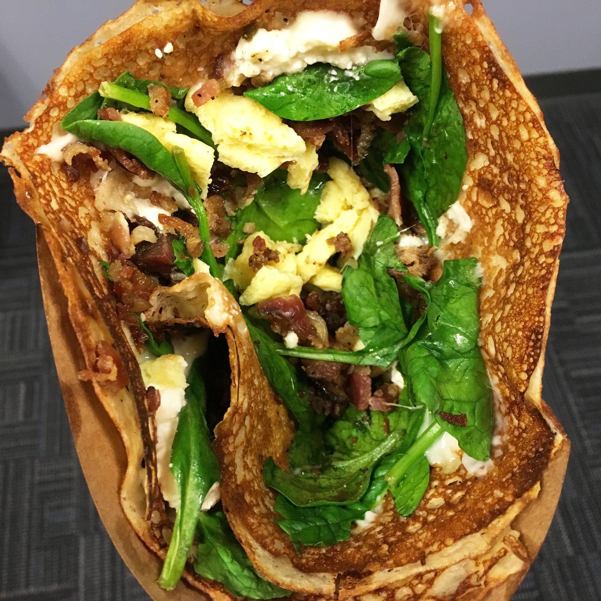 Now when you think crepes, you might automatically think “dessert.” Full of Crepe does offer a lineup of sweet crepe-y classics like Crepe Suzette and Bavarian Creme. But they also boast a full menu of savory breakfast/lunch-worthy options to suit any palate. Like I said, I am quickly becoming a regular at Full of Crepe, so I’ve tried a little bit of everything. My strategy is to usually grab two – one for now and one for later. Trust me on this…you’ll want another one for later. The great thing about crepes is that they reheat pretty well and are still just as mouthwateringly tasty later on. They’ll even wrap it up for you so it travels a little better, that is, if it even makes it to its destination before being devoured.