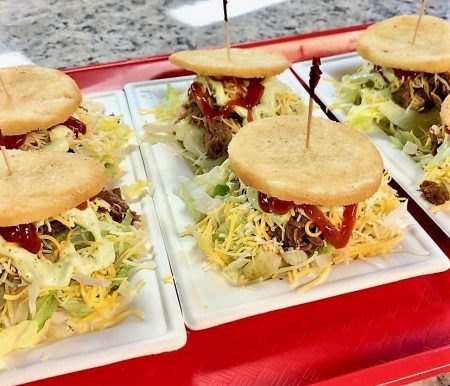 Shredded Beef Tostones, a sandwich of shredded beef with fried plantain slices for the “bread”