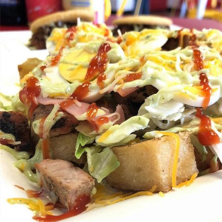 Chicken Cabimera, a uniquely Venezuelan dish similar in concept to loaded fries. Arepas are cut into pieces and fried, and topped with meats, cheeses, lettuce, boiled egg, sauces
