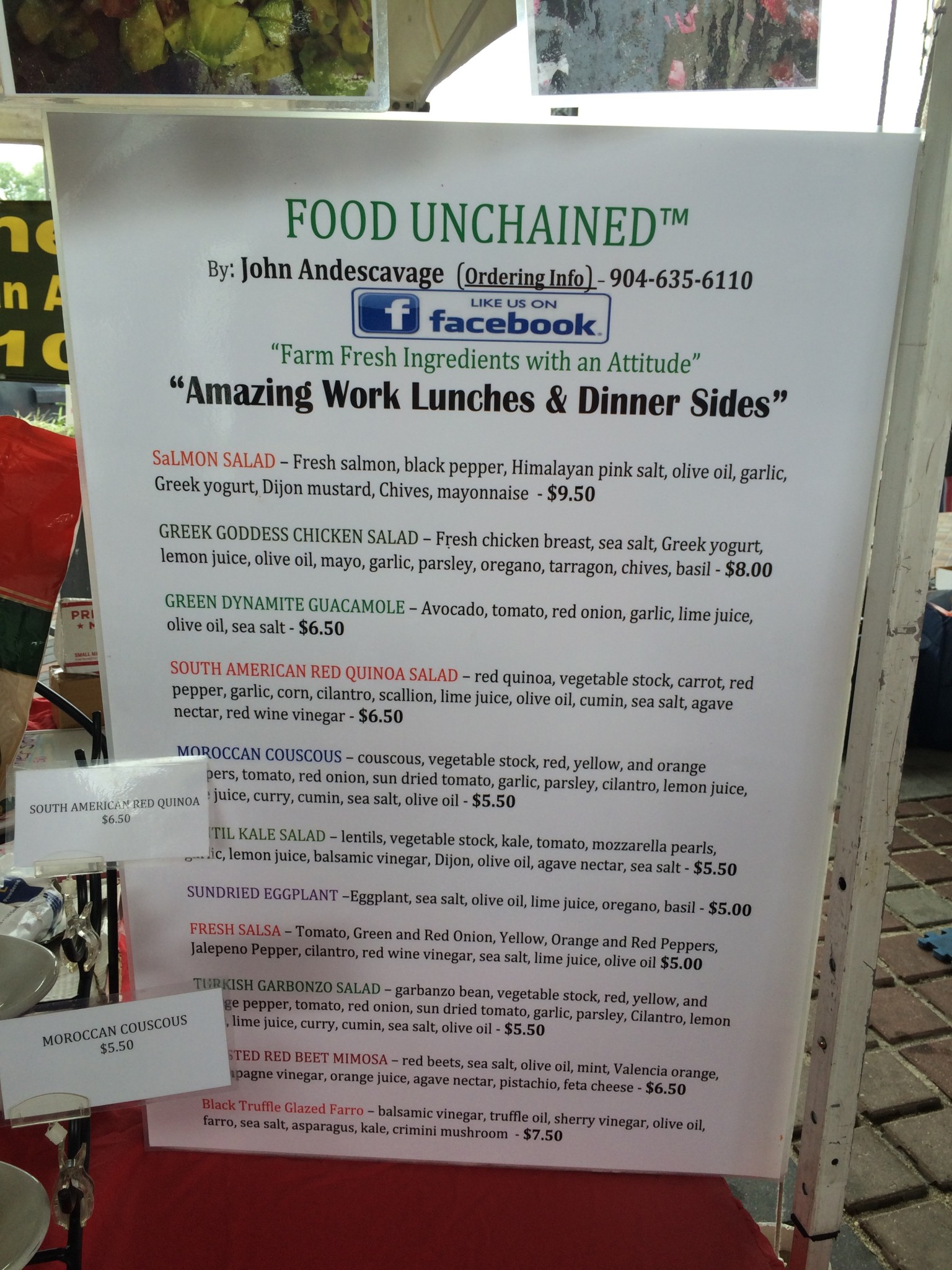 A few weeks ago we were invited out to the Riverside Arts Market to talk to John Andescavage, the owner of Food Unchained.  John grew up in Pennsylvania in the heart of Amish country and attended Johnson and Wales.  Post college, John decided to go out and explore the world outside of where he grew up to see what opportunities he could find. This led him to working for Club Med as the food and beverage director, which allowed him to travel and cook for ski resorts, venture to tropical Turks and Caicos, Cancun, and then establish himself later in Florida.  Following his career with Club Med, he became the executive chef for Duval County Schools,  In this role he was tasked with working alongside nutritionists and dieticians to create meal plans for 160 schools, including prepping up to 80,000 meals per day.  Working so closely with nutritionists gave John experience with understanding vitamin saturations, protein levels, and the science behind food.  To further his experience even more, John worked for Celebrity Cruise Lines as a cruise ship food and beverage director.  He worked with two ships and learned the delicate balance of working with hundreds of employees to serve people beautiful, and delicious foods.  His new venture, Food Unchained, is an aggregate of all his accumulated experience in the food and beverage field, as well as a passion for nutrition and making healthy food taste luxurious.  Food Unchained’s ingredients are purchased directly from local farmers and crafted into the creative fare that Food Unchained sells weekly at RAM.  Food Unchained can also be purchased throughout Florida at JB’s Nutrition, Nature’s Den, and Nutrition S’mart.