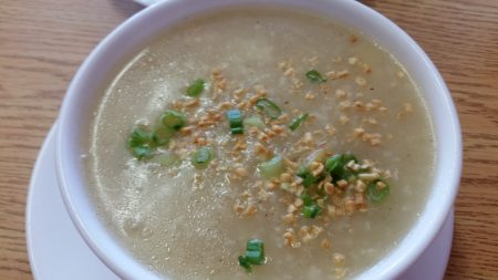Up next was the soups/stews; Kare Kare and Arroz Caldo. Kare Kare is an oxtail (sometimes neck bones) stew made with green beans, bok choy, and other vegetables all braised in a creamy peanut sauce. The real star of Kare Kare is the peanut sauce. Sure, the oxtail is the protein of the dish, but it’s the peanut sauce that ratchets up the flavor of everything in the stew and is great mixed with the side of garlic steamed rice. FilAm’s peanut sauce was perfect. It definitely had a peanut flavor, but didn’t overwhelm anything else in the bowl. The oxtail was tender and was easy to pick away from the bone. The green beans and bok choy still maintained their structural integrity among the stew; vibrant in color, still a bit crunchy and adding their texture and earthy, but mild flavor to the overall dish.