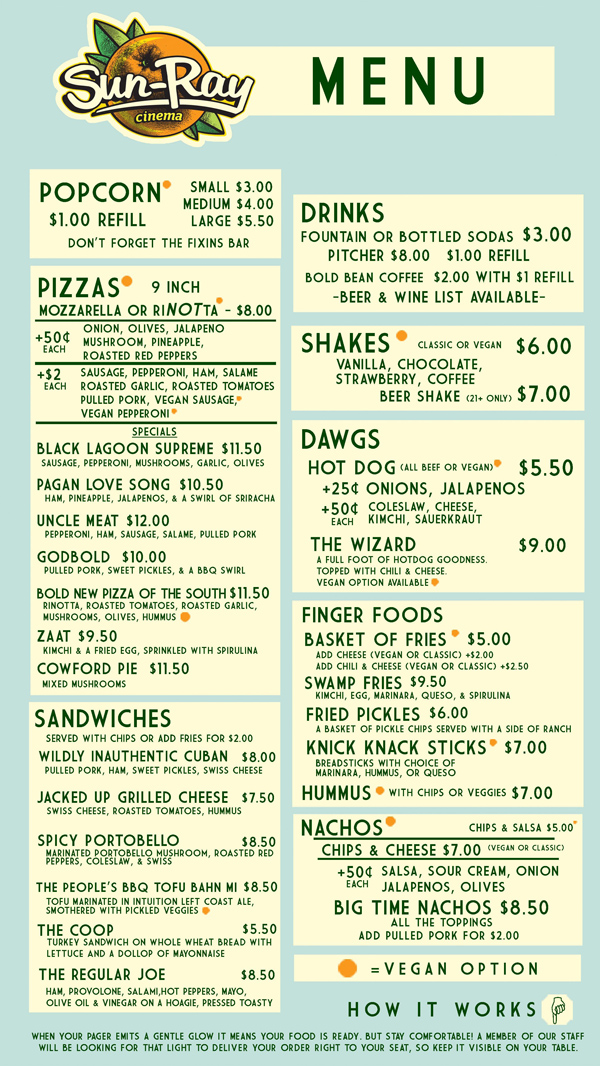In addition to the incredible food offerings, Sun-Ray cinema also offers local beers from Intuition, Bold City, PingleHead, Green Room, and Aardwolf to enjoy during your movie.  If you’re ready to head over to Sun-Ray, you can check out their movie times on their website, the Florida Times Union, and their Facebook.  Sun-Ray Cinema is one of the beautiful businesses that makes Jacksonville into the unique and diverse city that we are.  For our dedicated foodie readers we know that all the food choices will delight you.  Shana said it best as we chatted with her, “It’s magical.  It’s a cheesy word, but it’s a magical feeling to get a hot pepperoni pizza delivered to you.  And it’s comfort.  You can relax and focus on the movie because you don’t have to think about where you’re going after.  You don’t have to eat here, but it certainly makes it easier.”  And why wouldn’t you eat there?  With the extensive and gourmet menu that Sun-Ray Cinema is offering, it’ll quickly become a dining destination that truly is magical.