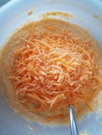 Sweet and Spicy Corn Dog Muffins, mixing the batter, yes, cheese!