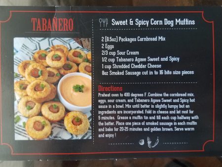Tabanero was kind enough to send three recipes along with the box of hot sauces which I’ve included pictures of for all our Tabanero current and future fans! Of the three, I miraculously had everything lying around the house to concoct the Sweet and Spicy Corn Dog Muffins, so I opted to make that for a mid-afternoon snack. It was super easy–I just mixed two boxes of cornbread mix, two eggs, sour cream, and and the Agave Sweet and Spicy in a bowl. I added the cheese and let that rest for a few minutes while I sliced sausages and preheated the oven. I poured the batter into a greased muffin tin, added the sausages to the center of each muffin, and into the oven it went! Twenty minutes later I had a delicious cornbread handheld snack that is perfect for tailgates and parties! Next time I make it I think I’ll opt for the Extra Hot in place of the Sweet and Spicy for a little more kick. Also if you want it extra cheesy, you won’t hurt a thing adding more cheese to the recipe!