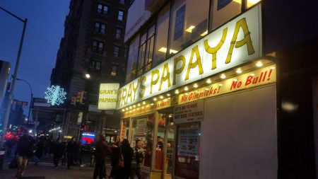 After blowing our food budget on Day 1 at Delmonico’s we decided to eat cheap on Day 2. I really wanted to experience a “dirty water dog” while in NYC, but there weren’t any food carts in our immediate area serving them at the time. Undeterred, I found out Gray’s Papaya was right up the street from our Airbnb.