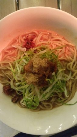 For my ramen, I ordered the Triple Garlic Triple Pork Mazeman. It’s made with tonkotsu (pork bone) broth, pork belly two ways (a nice sized chunk of pork belly and bits of bacon), and whole wheat noodles, topped with bonito powder. Unlike a traditional ramen, the sauce is much thicker, almost like an Italian style sauce. With the combination of the fatty pork belly and thick sauce, every slurp coats your palate and the flavor stays with you a little longer than a flavor would normally last after each bite. The sauce is super garlicky and delicious. Chef Orkin has mastered the art of Umami and it shows in this ramen. Is it a traditional tonkotsu ramen? No, and that’s a good thing.