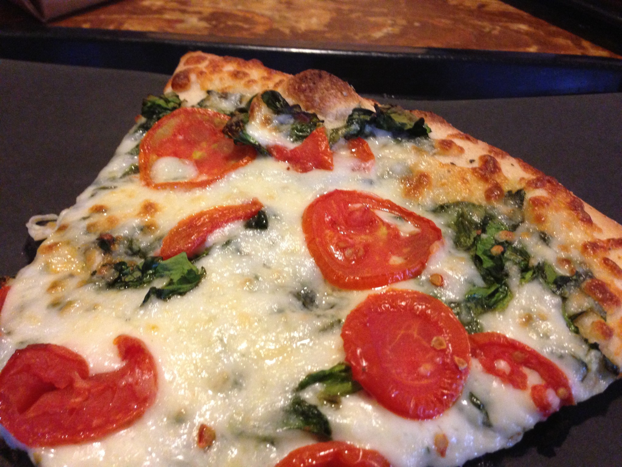 It’s been our experience that pizza by the slice is just a tad less delicious than a fresh, made to order pizza. Our trip to Leonardo’s by the slice was no exception. We had a Spin Tom (mozzarella, spinach, tomato, garlic, oregano) and a thick slice of pepperoni (thick slice with pizza sauce, mozzarella, pepperoni). With both slices, they were already made when we walked in and each slice was placed in the pizza oven for a few minutes to heat it up. They were good, but they didn’t shatter everything we had known about pizza. The Spin Tom was your typical thin crust, generous sized slice. The crust had a great garlic flavor and wasn’t greasy at all. The thick slice pepperoni was good if you are a deep dish pizza lover. It didn’t seem to have any more cheese or pepperoni than a thin crust slice, just more dough.