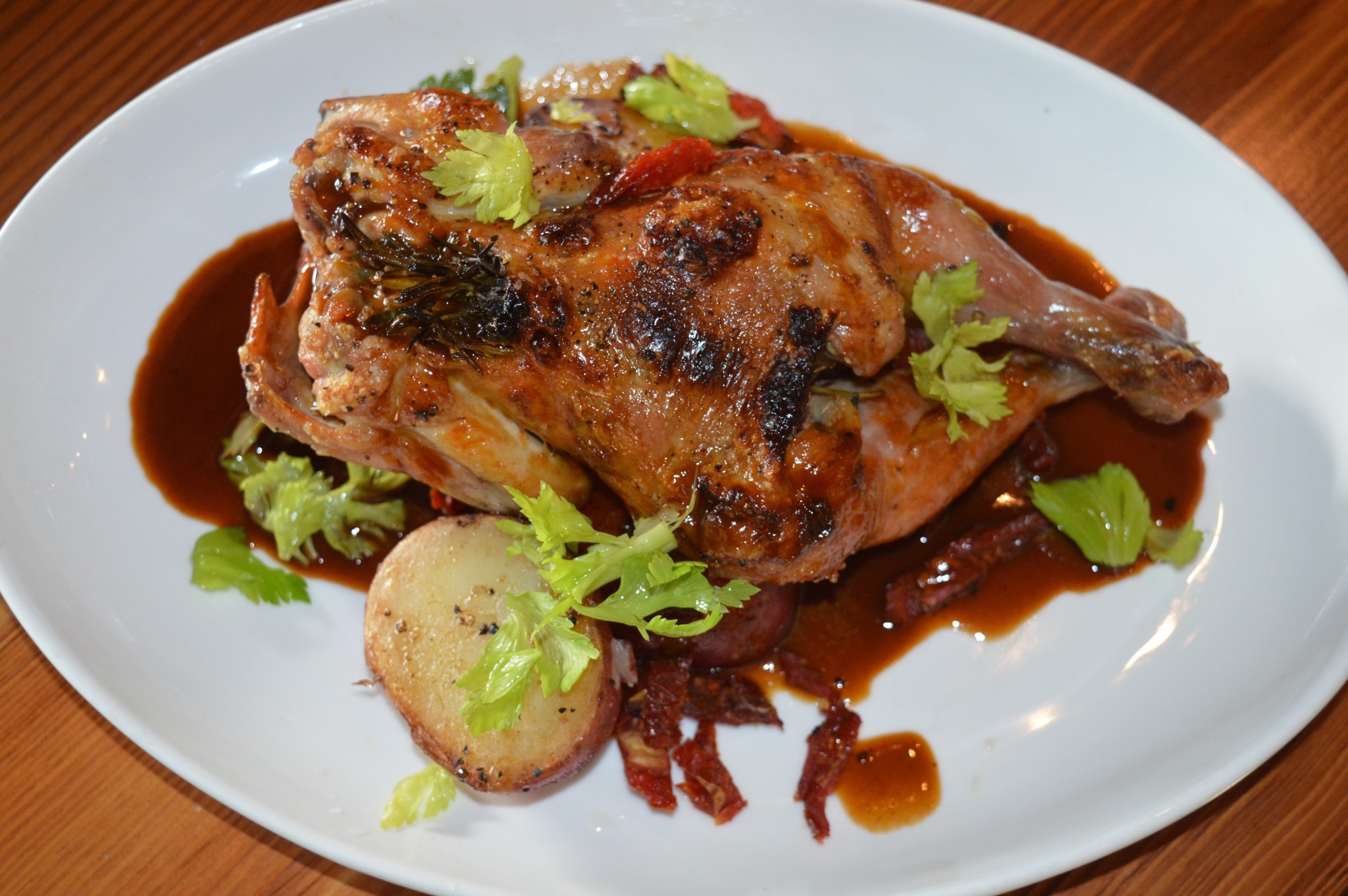 6. We then reheat chicken slightly to order.  Serve with vinegar potatoes and sun dried tomatoes.