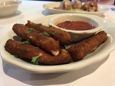 Doubters as we were, we asked the waitress before ordering if the pasta was made in house and she was proud to tell us that everything is made from scratch. We started with a side salad with basil vinaigrette ($2.99), mozzarella sticks ($6.99), and meatballs ($7.99). A personal pet peeve of mine is when a restaurant does not offer any salad dressings made in house. Salad dressing is the easiest thing to make from scratch and to me it shows a lack of care when restaurants only serve the bottled stuff. Siena’s makes a basil vinaigrette, which I thought was not only interesting and thoughtful, it was one of the better salad dressings I have ever had. It had an excellent flavor, but it wasn’t overpowering. It was a perfect salad dressing for an Italian restaurant. The salad that came with the vinaigrette was nice and fresh with various lettuces, and freshly chopped vegetables. When we saw the mozzarella sticks we knew we were in for a treat. They were just barely not uniform enough that we knew they were hand cut, breaded, and fried. If you are accustomed to having factory made frozen cheese sticks, do yourself a favor and go eat these babies. The difference is night and day. The quality of cheese and the freshness provide a completely different fried cheese experience. The house marinara sauce that came with the mozzarella sticks was a little too sweet for me, but both of my dining mates enjoyed it. The cheese sticks didn’t need sauce anyway. The meatballs were nice and big and meaty. We noticed the lack of “fillers” in the meatball. The marinara sauce they were covered in was the same sauce that came with the mozzarella sticks, but for whatever reason it did not taste as sweet with the meatballs. This had nothing to do with the sauce itself, but with the flavors that were with it in the mozzarella sticks and the meatballs.