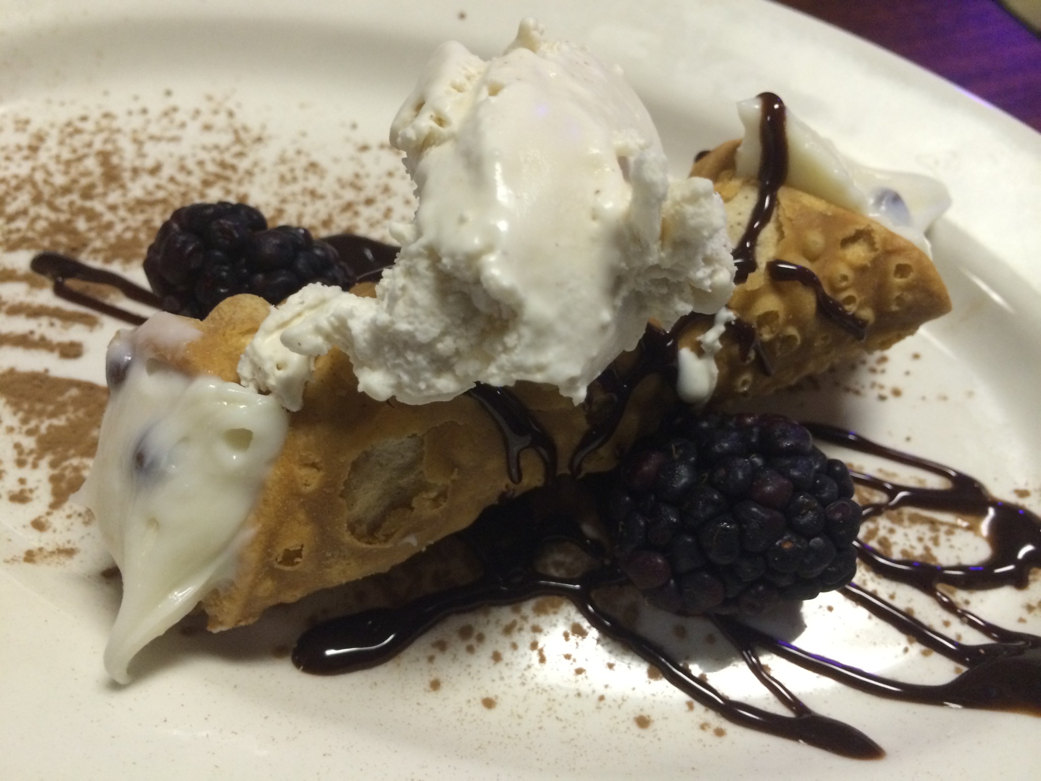 The next dish we tried was the Creamy garlic risotto topped with slow cooked pulled pork,bacon jam with caramelized onions, and house made chips. This dish had a decent amount of garlic flavor without being overpowering like garlic can sometimes be. The pulled pork is smoked 16 to 18 hours overnight and marinated overnight in orange juice. It was to die for! After 100+ restaurants in Jax I’d never have believed it if you told me I’d find my favorite pulled pork at an Italian place. Amazingly I did! The pulled pork had a wonderful pork flavor with fantastic undertones of orange that fell in love with. It was awesome on the pizza and even better on top of the risotto. You’ve gotta try this stuff! Wow! It’s unlike anything else in Jaxand reminds me of the sort of creation that could win a food network show. Last but not least we finished the meal off with a cannoli for dessert. It was really, really good. This one came with blackberries and had chocolate chips mixed in throughout the cream filling. The blackberries we a nice complement adding some tart to make the sweetness of the cream which we appreciated. The chocolate chips blended throughout was a nice upgrade of the standard presentation of putting chocolate chips on each end. The service we got at Perard’s was top notch. There was always someone around when we needed anything. When they know you’re coming that tends to happen. I will say everyone we observed around us got great service as well and we could see most of the people dining that evening from our table in the middle of the dining room.