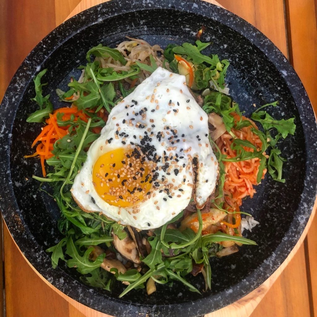 The Dolsot Bibimbap, a classic Korean entree, is served on a sizzling hot stone pot. It was the coolest thing on the menu and could easily feed 2 people! The portion was huge. It’s served with rice on the bottom then topped with egg, seasoned and pickled veggies and your meat choice. We opted for beef. The presentation of this dish was impressive and beautiful! The stone is really so hot that it crisps up the rice on the bottom. The traditional way to eat this dish is to mix it all up when it hits the table and go to town. The egg is served over medium-ish so you get the yolk in there and it’s a hodgepodge looking situation but the flavors — you’ll thoroughly enjoy this dish.