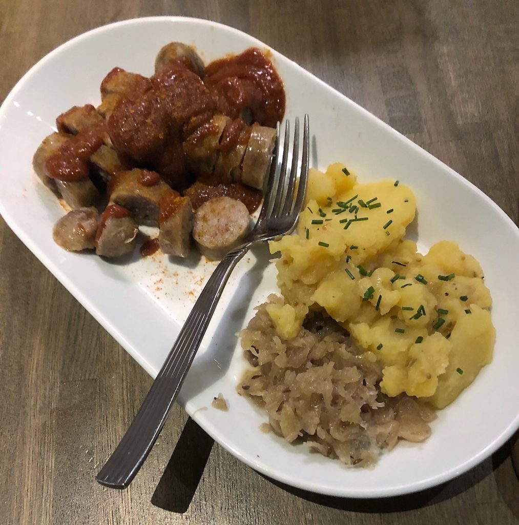 They also have traditional entrees on the menu like a Knackwurst ($7 sausage on a hard roll) and Buchner’s Reuben ($7). Chef Nicholas Benedict, who created the German-inspired menu, recommended the Currywürst to our table. It’s two full, sliced wursts drenched in a spicy, curry ketchup concoction. On any entree, you can add housemade kraut and German potato salat (potato salad with a vinegar base) for an additional $2.