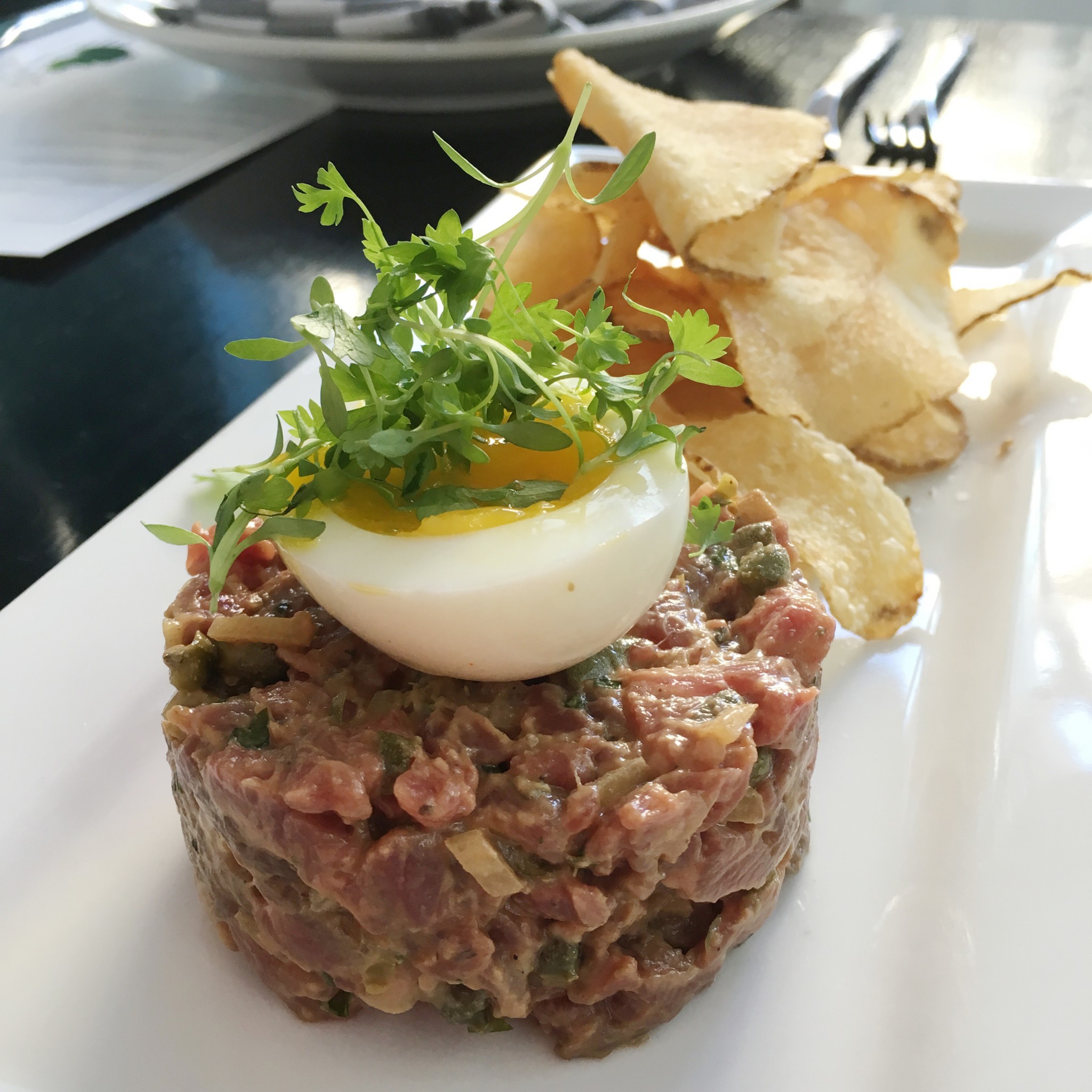 After our cocktails, we were treated to an assortment of appetizer offerings. These included a beautiful Beef Tenderloin Tartare, House Chips with Bacon Dip, Buffalo Chicken Croquettes, and a choice of French Onion Soup or a Wedge Caesar Salad. The Beef Tenderloin Tartare was surprisingly delicious. I am not a huge fan of beef tartare, but I enjoyed this one with its slight tanginess, which was offset by a creamy soft-boiled egg and served with crispy house chips. Those same House Chips made another appearance alongside creamy Smoked Bacon Dip. Be forewarned – the bacon dip is pretty addictive. The Buffalo Chicken Croquettes were equally alluring with their deep red coating of Franks Red Hot Sauce. The housemade blue cheese was a nice cooling accompaniment, and the shaved celery slaw added crunch.