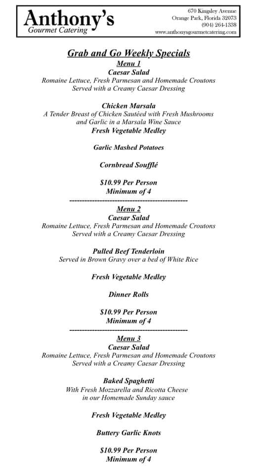 Anthony’s Gourmet Catering: As we are aiming to curb the spread of the coronavirus, locally owned Anthony’s Catering will be offering Grab and Go Weekly Specials beginning Wednesday.