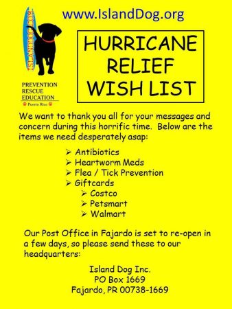 Island Dog is an animal rescue in Puerto Rico, also in need of supplies. You can send antibiotics, heartworm meds, flea/tick prevention, and gift cards to Petco, Petsmart, and Walmart to Island Dog Inc. PO Box 1669 Fajardo, PR 00738-1669