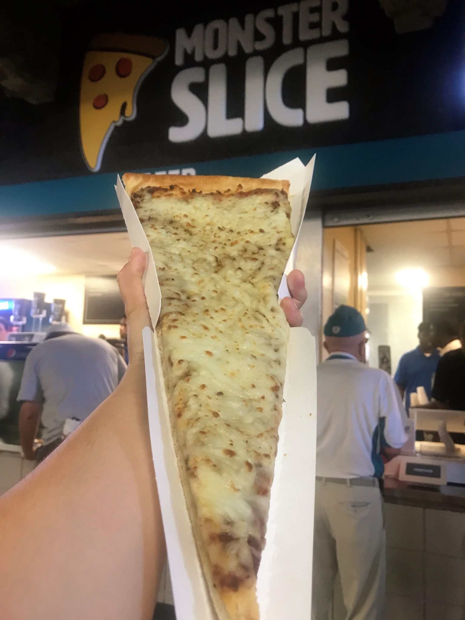 Monster Pizza is the new pizza option on the main concourse. If you’ve seen the pictures I can only tell you they are bigger in person. We got one and it was essentially the length of my arm. These impressive slices are the equivalent of at least 2 ½ pieces of pizza, probably more like 3. Not bad for $10. They’re pretty good. Not the best pizza of my life, but serviceable. It takes two hands to eat the first half of the monster slices. After that you can one hand it. As a bonus they are good for sharing with a significant other or BFF. Basically anyone you would eat after. Monster Pizza is a good and creative choice for serving pizza at the stadium. You can find Monster Pizza on the end of a few of the Stadium Classics concession stands throughout the main concourse.