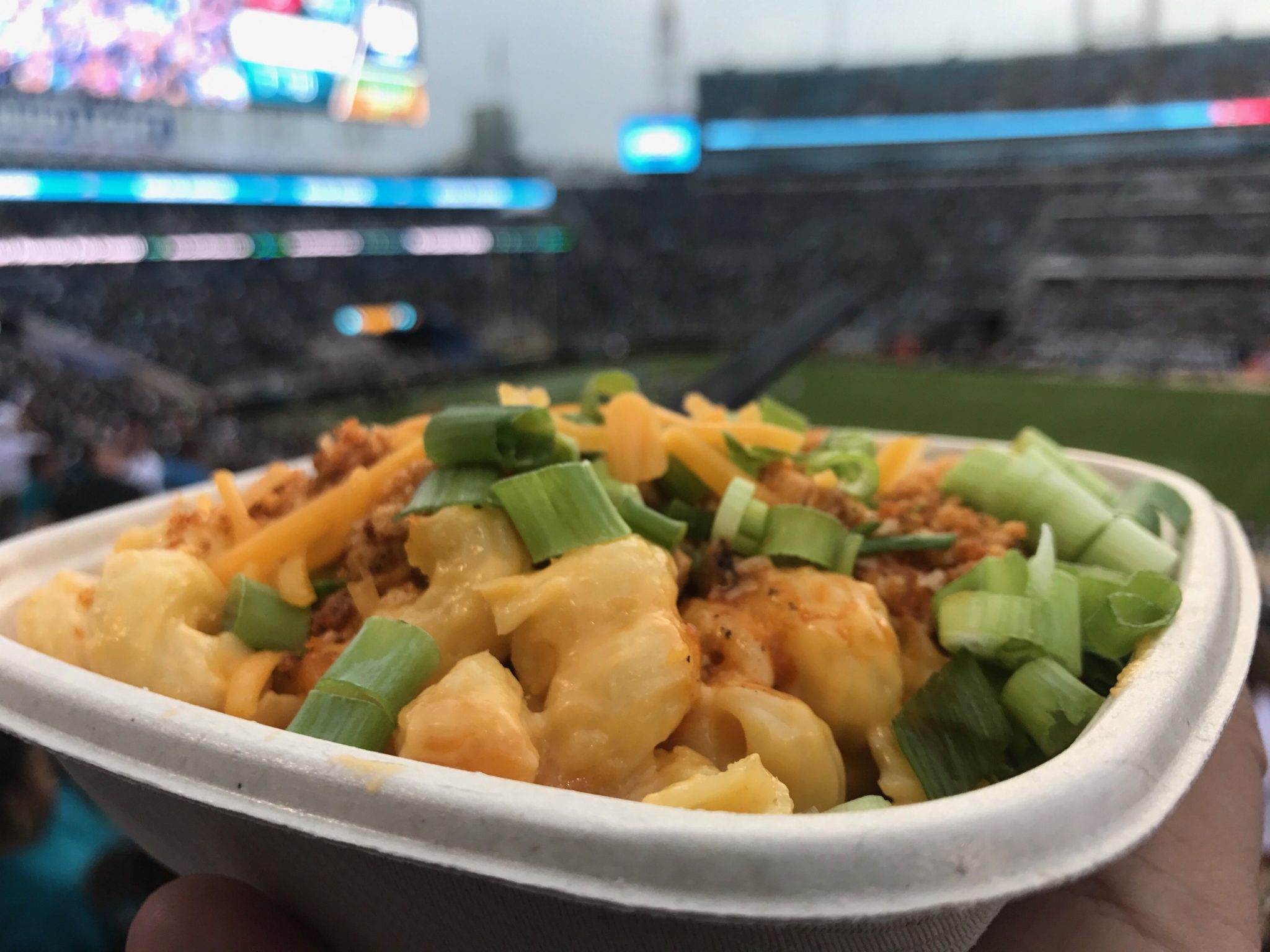 The mac n cheese stand offers loaded mac bowls with your choice of shredded buffalo chicken or shredded pork, and toppings of bread crumbs, cheese, green onions, and bacon. We’ve had the mac bowls at least three times in the last five games and truly it is the tastiest dish in all of the stadium. The cheesy mac base is absolutely delicious with cavatappi noodles and creamy cheese. The portion of both mac and meat is generous. At $11 this isn’t cheap, but it does feel like a good value for a stadium meal. Did we mention how tasty it is?
