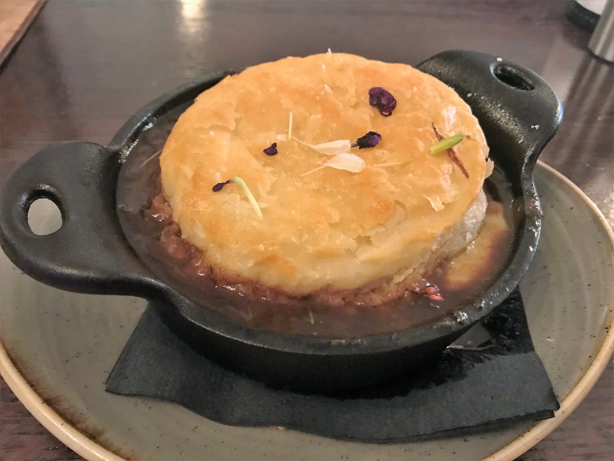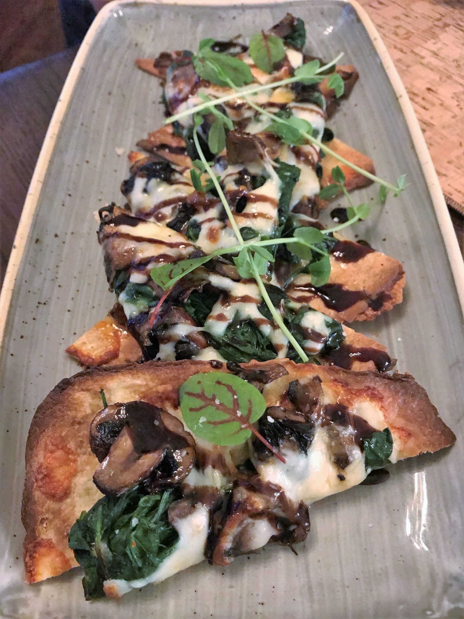 The menu is deceptively large. It doesn’t feel cumbersome because it is one page front and back, but it is pretty all encompassing with nine different starters, soups, salads, burgers, sandwiches, seafood options, pasta, meat and poultry, and sides. Stylistically it offers a handful of southern inspired options along with some more midwestern style choices and some older food trends. Realistically it is almost the same exact menu from the original MLG in the high end suburbs of Chicago. This is almost exactly the sort of menu my family from the midwest looks for. It’s hearty and has some sort of options everyone can feel comfortable with. For our appetizers we ordered The King’s French Onion Soup, the Crabby Patty, and the Wild Mushroom Flatbread. All three of these were visually appealing in the way they were plated. The french onion soup was topped with a circle of puff pastry that looked almost like a biscuit at first glance. Quite tantalizing. The puff pastry sat on some gooey, melty cheese, and the broth brimming with soft onions had a nice depth of flavor. This was enjoyable and I would order it again. The crab cake was the most expensive and least impressive of the appetizers we tried. It should be pricier, it’s crab. But at $17 for two crab cakes, the flavor didn’t placate the cost. There was nothing wrong with it, it just didn’t do anything for us. The mushroom flatbread was a nice, shareable appetizer. It was several triangles loosely overlapping each other on the dish, covered with sauteed spinach, fontina cheese, copious mushrooms, and finished with balsamic. There was some truffle oil in there, too. The truffle was nice and mild, not overpowering. This was a solid dish and good for sharing that absolutely anyone can enjoy.