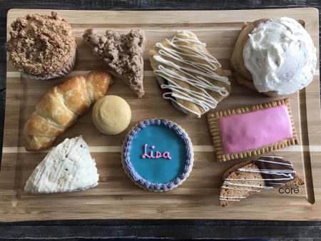 The newest development for MotionSweets is MotionSweetsAM, a breakfast line of freshly baked gourmet pastries. After over six months of development, Adrian asked us to come try what they had come up with ahead of the launch. We sampled a Black Forest Ham, Gouda, and Spinach Egg Souffle, Biscoff Cookie Butter Muffin, Coffee Cake, Blueberry Danish, Cinnamon Roll, Strawberry Poptart, Vanilla Bean Biscotti, Lemon Lavender Scone, Chicken and Waffle Macaron, Croissant, and a personalized Sugar Cookie. The thing to know is We.Loved.Everything. Truly. The flavors ran the gamut and were executed at the highest level.