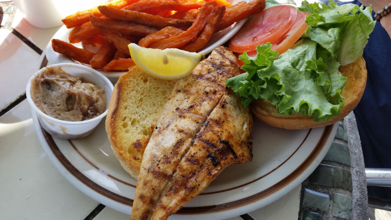 My dining partner ordered the Sandollar Sandwich. The Sandollar Sandwich is a grilled Redfish served in a roll with lettuce, tomato, and onion. It came with tartar sauce and cocktail sauce on the side. For a side dish, she chose sweet potato fries with cinnamon sugar butter. The Redfish itself had good flavor, but it was dry and room temp. I was thankful for the tartar sauce to add some moisture to the sandwich. Without it, each bite dried out my mouth completely and made it hard to eat. The sweet potato fries were room temp and floppy. They were not crispy and didn’t stand up well to dipping in the cinnamon sugar butter. A fresh, hot, crispy fry would’ve cut through the butter, melted it a bit, and enhanced the flavor. Because of the floppiness and temperature of the fry, I had to use my finger as a “backbone” of sorts to give stability to the fry as I dipped it in the cinnamon sugar butter. Even then it tasted like cold cinnamon sugar butter on a cold fry.
